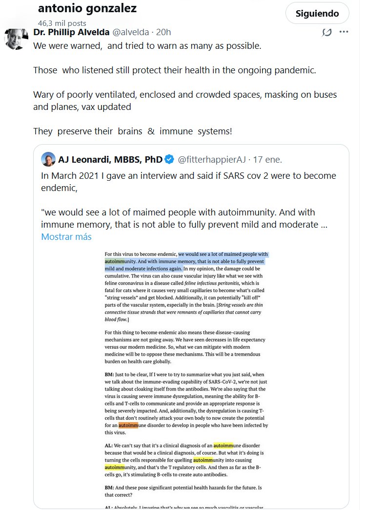 El Prof. Antonio González repitió con el Dr. Phillip Alvelda @alvelda Nos advirtieron e intentamos advertir a la mayor cantidad posible de personas. Quienes nos escucharon siguen protegiendo su salud durante la pandemia. Preocupados por los espacios mal ventilados, cerrados y abarrotados, el uso de mascarillas en autobuses y aviones, la vacunación actualizada. ¡Preservan sus cerebros y sistemas inmunitarios! Cita a AJ Leonardi, MBBS, PhD @fitterhappierAJ En marzo de 2021, di una entrevista y comenté que si el SARS-CoV-2 se volviera endémico, «veríamos a muchas personas mutiladas con autoinmunidad. Y con la memoria inmunitaria, esta no es capaz de prevenir completamente las infecciones leves y moderadas. En mi opinión, el daño podría ser acumulativo»