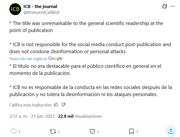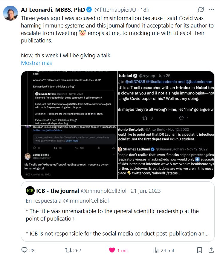 AJ Leonardi, MBBS, PhD @fitterhappierAJ Hace tres años me acusaron de desinformación porque dije que el Covid estaba dañando el sistema inmunológico y esta revista consideró aceptable que su autor pasara de tuitearme emojis 🤡 a burlarse de mí con los títulos de sus publicaciones. Ahora, esta semana daré una charla sobre la disfunción inmunológica mediada por COVID a colegas médicos de una fundación de defensa de la salud.