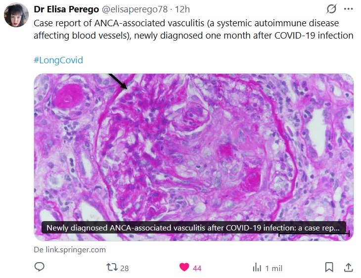 Dr Elisa Perego @elisaperego78 · Case report of ANCA-associated vasculitis (a systemic autoimmune disease affecting blood vessels), newly diagnosed one month after COVID-19 infection #LongCovid