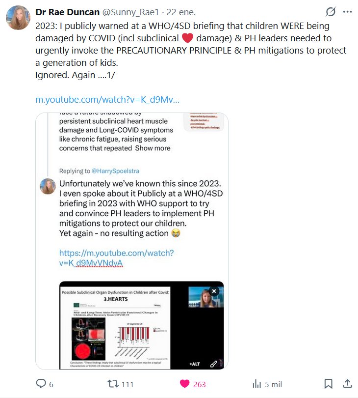 Dra. Rae Duncan @Sunny_Rae1 · 2023: Advertí públicamente en una sesión informativa de la OMS/4SD que la COVID-19 estaba dañando a los niños (incluidos los daños subclínicos ❤️) y que los líderes de salud pública debían invocar urgentemente el PRINCIPIO DE PRECAUCIÓN y las medidas de mitigación para proteger a una generación de niños. Ignorado. De nuevo…