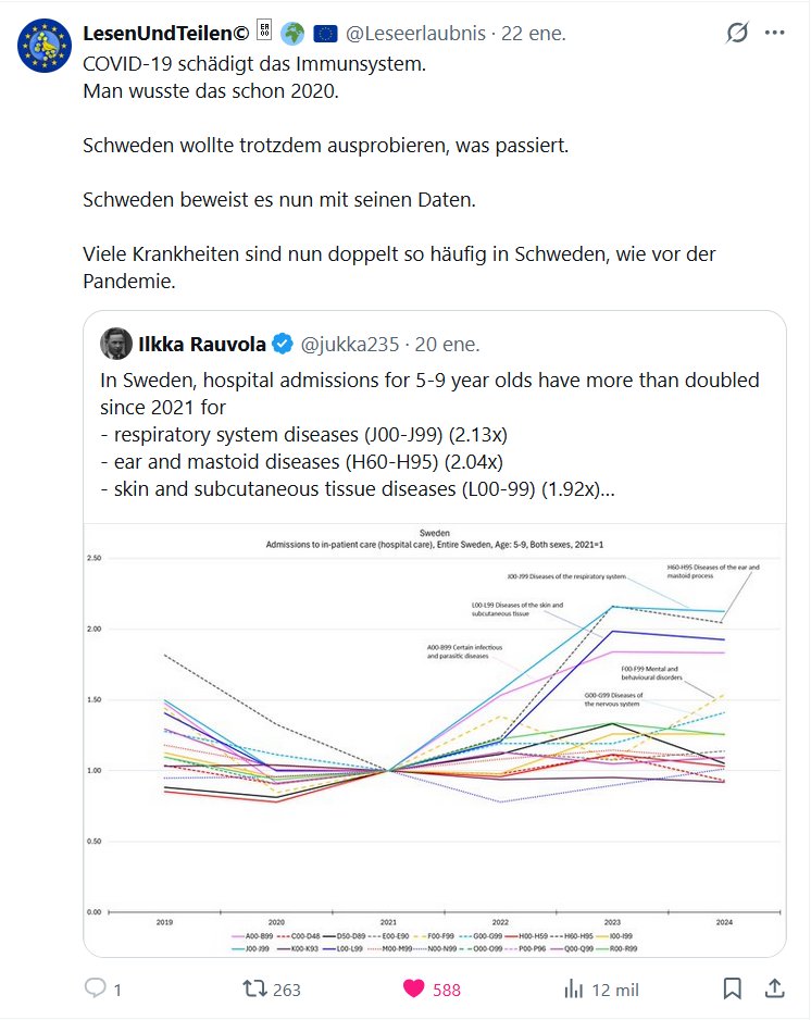 EN ALEMÁN ReadAndShare©  🌍 🇪🇺 @ReadingPermission · La COVID-19 daña el sistema inmunitario. Esto ya se sabía en 2020. Suecia quería comprobar qué ocurriría. Suecia lo está demostrando ahora con sus datos. Muchas enfermedades son ahora el doble de comunes en Suecia que antes de la pandemia.
