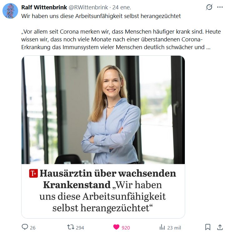 EN ALEMÁN Ralf Wittenbrink @RWittenbrink 24 de junio de 2026 Nos hemos atribuido esta incapacidad para trabajar. «Especialmente desde la pandemia, hemos notado que las personas enferman con más frecuencia. Hoy sabemos que durante muchos meses después de recuperarse de la COVID-19, el sistema inmunitario de muchas personas permanece significativamente más débil y…»