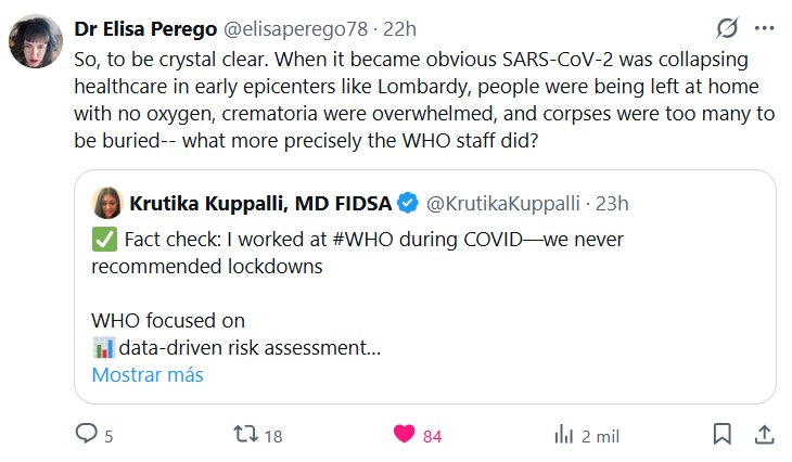 INDIGNACIÓN Y PREGUNTAS Dra. Elisa Perego @elisaperego78 · Para ser completamente clara, cuando se hizo evidente que el SARS-CoV-2 estaba colapsando la atención médica en epicentros tempranos como Lombardía, la gente se quedaba en casa sin oxígeno, los crematorios estaban desbordados y había demasiados cadáveres para ser enterrados, ¿qué hizo exactamente el personal de la OMS?