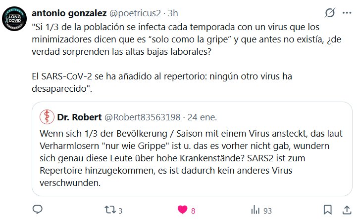 Prof. Antonio González @poetricus2 · «Si 1/3 de la población se infecta cada temporada con un virus que los minimizadores dicen que es “solo como la gripe” y que antes no existía, ¿de verdad sorprenden las altas bajas laborales? El SARS-CoV-2 se ha añadido al repertorio: ningún otro virus ha desaparecido».