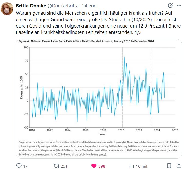 EN ALEMÁN Britta Domke @DomkeBritta • ¿Por qué exactamente la gente se enferma con más frecuencia que antes? Un amplio estudio estadounidense (10/2025) señala una razón importante. Según el estudio, la COVID-19 y sus enfermedades secundarias han creado un nuevo punto de referencia para las bajas por enfermedad un 12,9 % más alto.