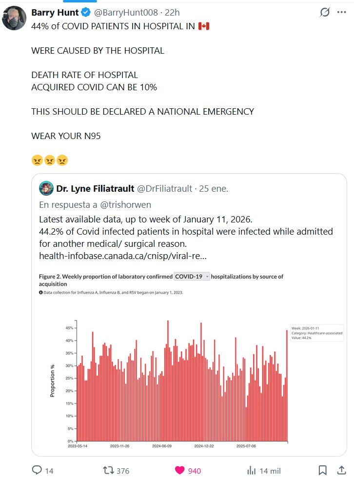 Barry Hunt @BarryHunt008 · El 44% de los pacientes con COVID hospitalizados en 🇨🇦 fueron causados por el hospital. La tasa de mortalidad hospitalaria por COVID puede ser del 10%. Esto debería declararse una emergencia nacional. Use su mascarilla N95. 😠😠😠