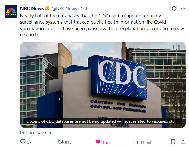 NBC News @NBCNews · Casi la mitad de las bases de datos que los CDC solían actualizar regularmente (sistemas de vigilancia que rastreaban información de salud pública, como las tasas de vacunación contra la COVID-19) se han suspendido sin explicación, según un nuevo estudio.