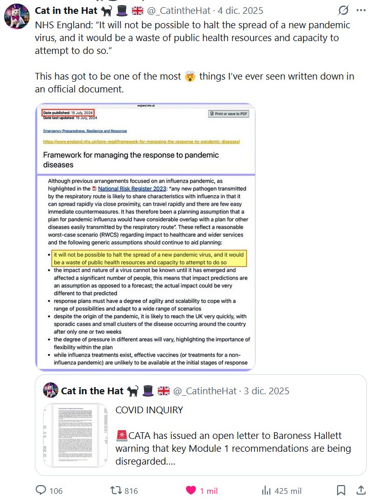 SINCERICIDIO COVID Cat in the Hat 🐈⬛ 🎩 🇬🇧 @_CatintheHat 4 dic. 2025 NHS England: “No será posible detener la propagación de un nuevo virus pandémico, y sería un desperdicio de recursos y capacidad de salud pública intentarlo”. Esto debe ser una de las cosas más 🤯 que he visto escritas en un documento oficial.