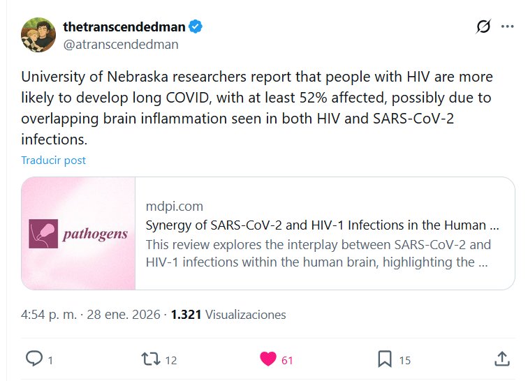 Thetranscendedman @atranscendedman Investigadores de la Universidad de Nebraska informan que las personas con VIH tienen mayor probabilidad de desarrollar COVID-19 persistente, con al menos un 52 % afectado, posiblemente debido a la inflamación cerebral superpuesta observada tanto en las infecciones por VIH como por SARS-CoV-2.