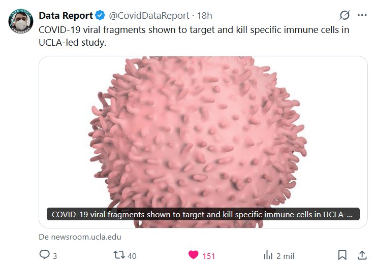 Data Report @CovidDataReport Un estudio dirigido por la UCLA demostró que fragmentos del virus COVID-19 atacan y destruyen células inmunes específicas. Posted on enero 30, 2026 por coronado https://newsroom.ucla.edu/releases/covid-19-viral-fragments-target-kill-specific-immune-cells