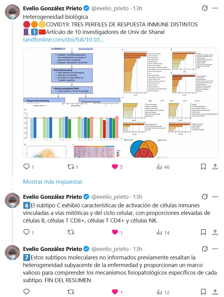 Evelio González Prieto @evelio_prieto · 13h Heterogeneidad biológica 🔴🟠🟡COVID19: TRES PERFILES DE RESPUESTA INMUNE DISTINTOS 🧵1⃣🇨🇳Artículo de 10 investigadores de Univ de Shanxi Posted on febrero 1, 2026 por coronado https://www.tandfonline.com/doi/full/10.1080/08916934.2026.2618284#d1e608