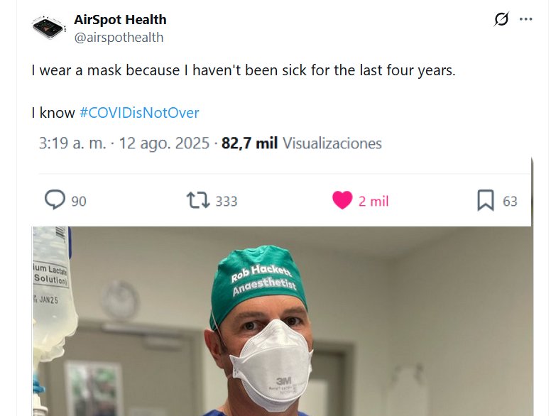 TESTIMONIOS AirSpot Health @airspothealth Uso mascarilla porque no he estado enfermo en los últimos cuatro años. Sé que #COVIDNoHaTerminado Posted on febrero 1, 2026 por coronado