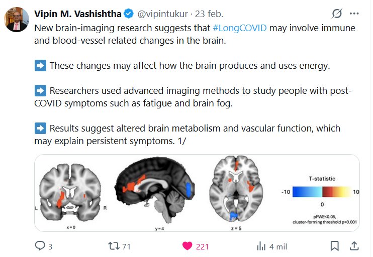 Vipin M. Vashishtha @vipintukur · 23 feb. 2026 Una nueva investigación con imágenes cerebrales sugiere que la #COVIDPersistente podría implicar cambios en el sistema inmunitario y los vasos sanguíneos del cerebro. ➡️ Estos cambios podrían afectar la forma en que el cerebro produce y utiliza energía.