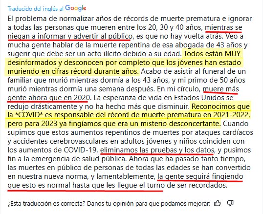 ESCUCHO VOCES «El Covid mató al Papa. Y a la Reina. Y a Pelé. Es la razón por la que Biden abandonó la carrera. Es la razón por la que tu artista favorito está enfermo, ha dejado de girar o ha sufrido graves complicaciones de salud. Es la razón por la que los niños están fracasando en la escuela, es la razón por la que las escuelas están fracasando. Todo es por el Covid.»