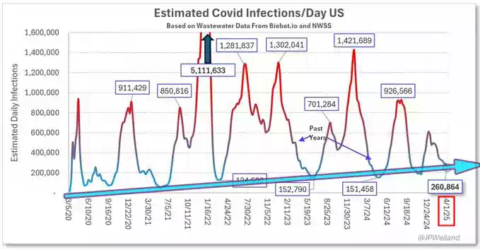 10 DE MAYO DE 2025: Mike Hoerger, PhD MSCR MBA @michael_hoerger · 15 de julio de 2021 Ese es el último día que EE. UU. bajó de 200,000 infecciones diarias de COVID, según estimaciones de PMC basadas en datos de aguas residuales de los CDC. Estamos cerca de superar esa cifra, con un estimado de 232,000 al día. Presten atención. Los casos volverán a aumentar pronto.