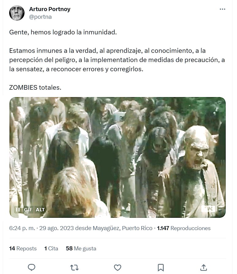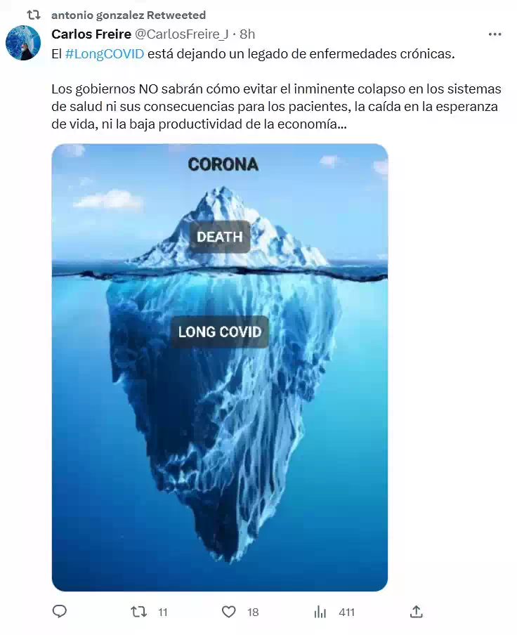 ESTO ES LO QUE EN REALIDAD QUIEREN? "Desafortunadamente esto es la mayor verdad. Pensar que COVID19 terminó por un decreto humano en mayo/23, es dejar de gestionar el riesgo para prevenirlo y por tanto rendirse a aceptar las múltiples infecciones que lo único que lograrán es incrementar el número de pacientes con #LongCovid"