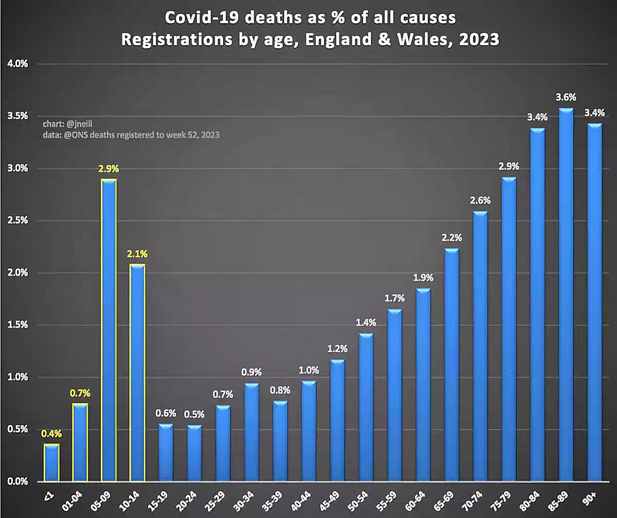 “Aproximadamente 60 niños murieron de COVID en los EEUU en junio. Dos al dia. Uno cada doce horas. Desde enero de 2023 trescientos niños en EEUU han muerto de COV1D. Los que mueren de COV1D en seis meses duplican a los que mueren de gripe en todo un año”