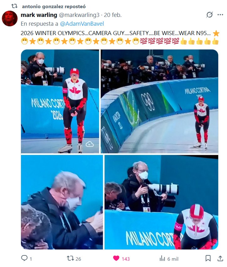 El profesor Antonio González reposteó a Mark Warling @markwarling3 · 20 feb. 2026 En respuesta a @AdamVanBavel Juegos Olímpicos de Invierno 2026… Camarógrafo… Seguridad… Precaución… Usar mascarilla N95… ⭐😷⭐😷⭐😷⭐😷⭐😷⭐😷⭐😷⭐😷💯💯💯💯👍👍👍👍👍