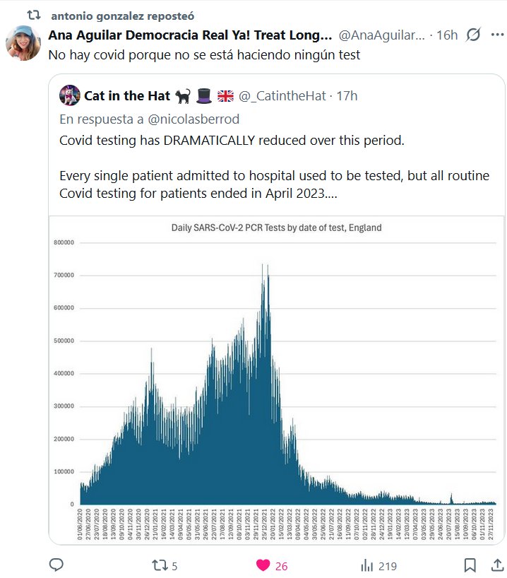 Prof. Antonio González reposteó Ana Aguilar Democracia Real Ya! Treat Long Covid! @AnaAguilarPAC · No hay covid porque no se está haciendo ningún test