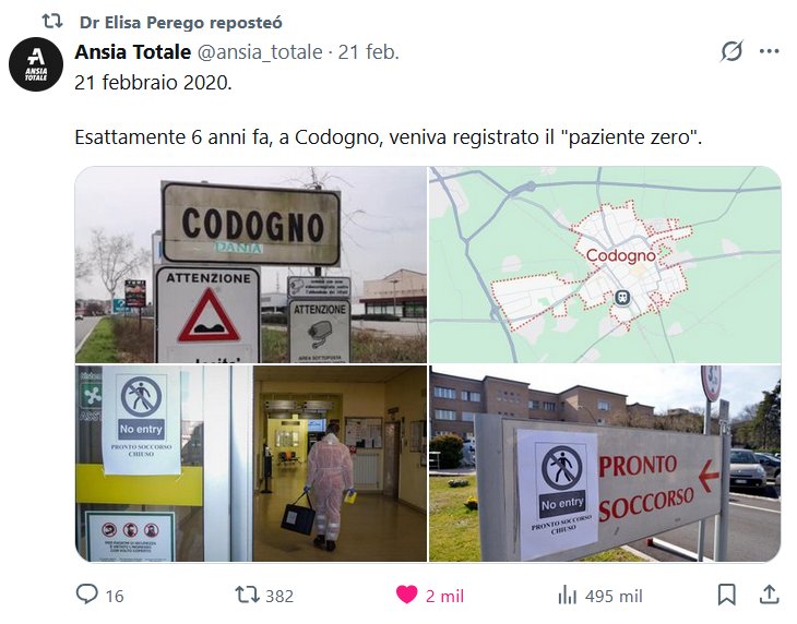 PACIENTE CERO EN ITALIA La Dra. Elisa Perego republicó a Ansia Totale @ansia_totale · 21 de febrero de 2026 21 de febrero de 2020. Hace exactamente 6 años, en Codogno, se registró el caso del «paciente cero».