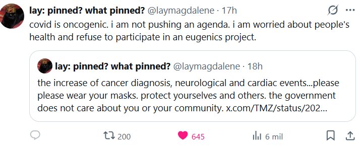 Lay: ¿Fijado? ¿Qué fijado? @laymagdalene · El COVID es oncogénico. No estoy impulsando una agenda. Me preocupa la salud de las personas y me niego a participar en un proyecto eugenésico. El aumento de diagnósticos de cáncer, eventos neurológicos y cardíacos… Por favor, usen mascarillas. Protéjanse y protejan a los demás. Al gobierno no le importan ustedes ni su comunidad.