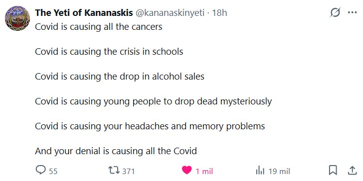 El Yeti de Kananaskis @kananaskinyeti · El Covid está causando todos los cánceres El Covid está causando la crisis en las escuelas El Covid está causando la caída en la venta de alcohol El Covid está causando que jóvenes caigan muertos misteriosamente El Covid está causando tus dolores de cabeza y problemas de memoria Y tu negación está causando todos los problemas de Covid