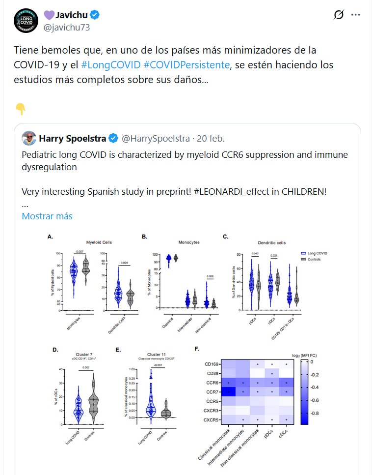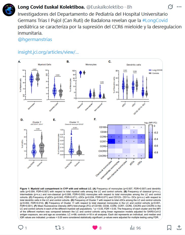 DR. Harry Spoelstra @HarrySpoelstra La COVID persistente pediátrica se caracteriza por la supresión del receptor mieloide CCR6 y la desregulación inmunitaria. ¡Un estudio español muy interesante en preimpresión! ¡#LEONARDI_effect en NIÑOS! ➡️El receptor de quimiocina CCR6 en la superficie de las células mieloides, que incluyen monocitos, macrófagos y células dendríticas, desempeña un papel clave en el sistema inmunitario innato.