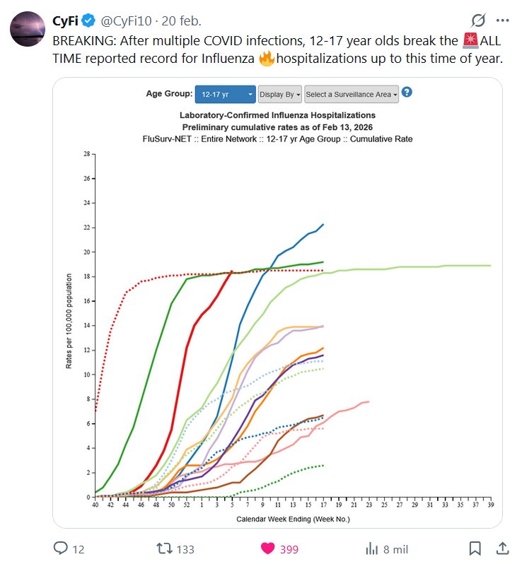 CyFi @CyFi10 · 20 feb. 2026 ÚLTIMA HORA: Tras múltiples contagios de COVID-19, jóvenes de entre 12 y 17 años rompen el récord histórico de hospitalizaciones por influenza hasta esta época del año.