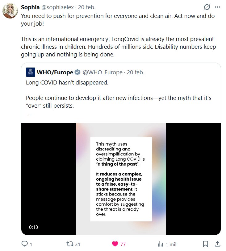 Sophia @sophiaelex · 20 feb. 2026 Es necesario impulsar la prevención para todos y un aire limpio. ¡Actúa ahora y haz tu trabajo! ¡Esta es una emergencia internacional! La COVID-19 persistente ya es la enfermedad crónica más prevalente en niños. Cientos de millones de personas están enfermas. El número de personas con discapacidad sigue aumentando y no se hace nada. Cita a OMS/Europa @WHO_Europe · La COVID-19 persistente no ha desaparecido. Las personas continúan desarrollándola después de nuevas infecciones, pero el mito de que ya pasó persiste.