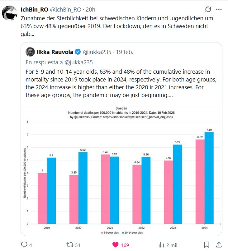 COCID Y POSTCOVID HACEN ESTRAGOS (EN ALEMÁN) IchBin_RO @IchBin_RO · La mortalidad entre niños y adolescentes suecos aumentó un 63% y un 48%, respectivamente, en comparación con 2019. El confinamiento que Suecia no impuso… Cita Ilkka Rauvola @jukka235 · 19 de febrero En respuesta a @jukka235 En el grupo de 5 a 9 años y de 10 a 14 años, el 63% y el 48% del aumento acumulado de la mortalidad desde 2019 se produjo en 2024, respectivamente. Para ambos grupos de edad, el aumento de 2024 es mayor que el de 2020 o 2021. Para estos grupos de edad, es posible que la pandemia apenas estuviera comenzando.