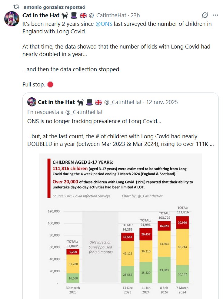 El profesor Antonio González reposteó a Cat in the Hat 🐈‍⬛ 🎩 🇬🇧 @_CatintheHat El profesor Antonio González reposteó El Gato Ensombrerado 🐈‍⬛ 🎩 🇪🇸 @_CatintheHat · Han pasado casi dos años desde la última vez que la @ONS encuestó el número de niños con Covid Persistente en Inglaterra. En aquel entonces, los datos mostraban que el número de niños con Covid Persistente casi se había duplicado en un año… …y entonces se interrumpió la recopilación de datos. Punto final. 🛑