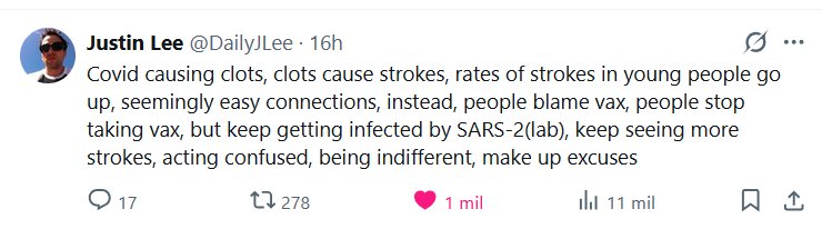 Justin Lee @DailyJLee · El COVID-19 causa coágulos, los coágulos causan accidentes cerebrovasculares, las tasas de accidentes cerebrovasculares en jóvenes aumentan, conexiones aparentemente fáciles, pero en cambio, la gente culpa a la vacuna, la gente deja de vacunarse, pero siguen infectándose con SARS-2 (laboratorio), siguen viendo más accidentes cerebrovasculares, se muestran confundidos, son indiferentes, inventan excusas.