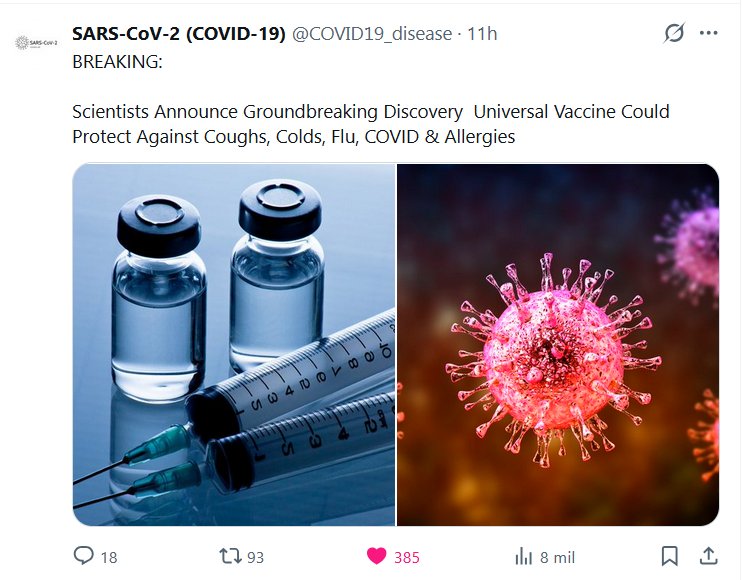 SARS-CoV-2 (COVID-19) @COVID19_disease · ÚLTIMA HORA: Científicos anuncian un descubrimiento revolucionario: una vacuna universal podría proteger contra la tos, el resfriado, la gripe, la COVID-19 y las alergias