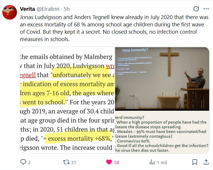 LESA HUMANIDAD Verita @Eiralinn · Jonas Ludvigsson y Anders Tegnell ya sabían en julio de 2020 que hubo un exceso de mortalidad del 68 % entre los niños en edad escolar durante la primera ola de COVID. Pero lo mantuvieron en secreto. No se cerraron escuelas ni se implementaron medidas de control de infecciones en las escuelas.