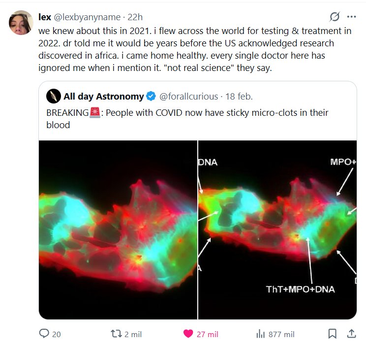 Lex @lexbyanyname · Nos enteramos de esto en 2021. Viajé por todo el mundo para hacerme pruebas y recibir tratamiento en 2022. El médico me dijo que pasarían años antes de que Estados Unidos reconociera la investigación descubierta en África. Regresé sana. Todos los médicos aquí me han ignorado cuando lo menciono. Dicen que «no es ciencia real». Cita A Astronomía todo el día @forallcurious · 18 feb. 2026 ÚLTIMA HORA🚨: Las personas con COVID ahora tienen microcoágulos pegajosos en la sangre.