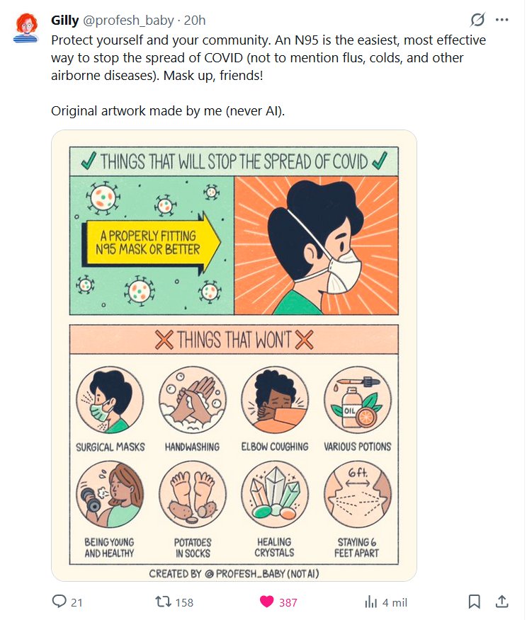 Gilly @profesh_baby · Protégete y protege a tu comunidad. Una mascarilla N95 es la manera más fácil y efectiva de detener la propagación del COVID (sin mencionar las gripes, los resfriados y otras enfermedades transmitidas por el aire). ¡Usen mascarilla, amigos! Arte original hecho por mí (nunca con IA).