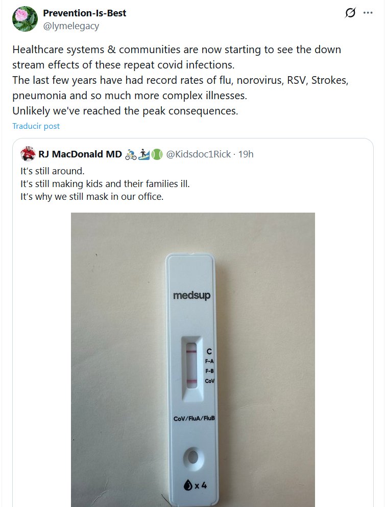 Prevenir es lo mejor @lymelegacy · Los sistemas de salud y las comunidades están empezando a ver las consecuencias de estas infecciones recurrentes por COVID-19. En los últimos años se han registrado tasas récord de gripe, norovirus, VSR, accidentes cerebrovasculares, neumonía y muchas otras enfermedades complejas. Es poco probable que hayamos llegado a su punto máximo.