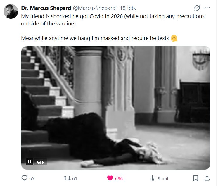 TESTIMONIOS Dr. Marcus Shepard @MarcusShepard · Mi amigo está sorprendido de haberse contagiado de COVID en 2026 (sin tomar ninguna precaución aparte de la vacuna). Mientras tanto, siempre que quedamos, uso mascarilla y le exijo que se haga la prueba. 🫠