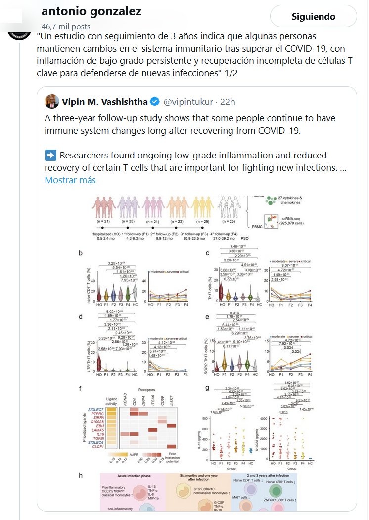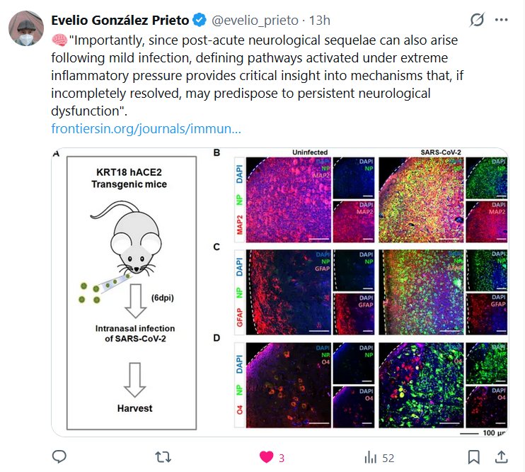 Dr. Evelio González Prieto @evelio_prieto · 🧠"Es importante destacar que, dado que las secuelas neurológicas postagudas también pueden surgir tras una infección leve, definir las vías que se activan bajo una presión inflamatoria extrema proporciona información crucial sobre los mecanismos que, si no se resuelven por completo, pueden predisponer a una disfunción neurológica persistente".