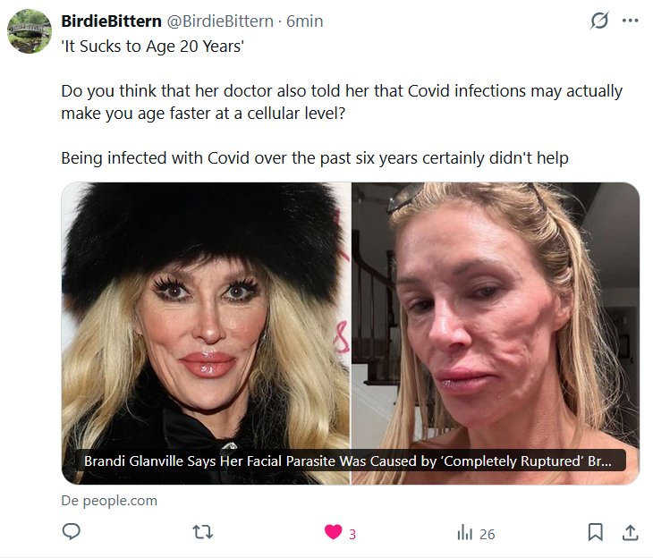 BirdieBittern @BirdieBittern · «Es horrible envejecer 20 años» ¿Crees que su médico también le dijo que las infecciones por COVID-19 podrían acelerar el envejecimiento celular? Haber estado infectada con COVID-19 durante los últimos seis años ciertamente no ayudó.