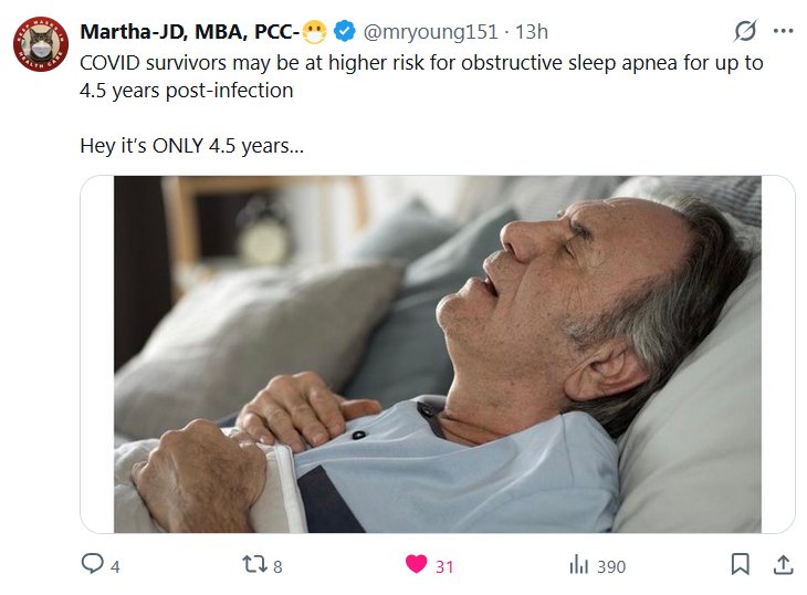 Martha-JD, MBA, PCC-😷 @mryoung151 · Los sobrevivientes de COVID podrían tener un mayor riesgo de apnea obstructiva del sueño hasta 4,5 años después de la infección. ¡Oye, son SOLO 4,5 años! [SARCASMO]