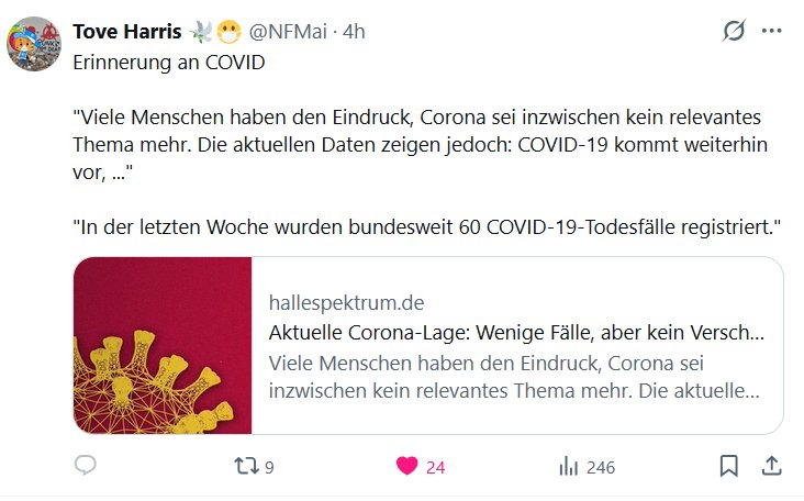 EN ALEMÁN Tove Harris 🕊😷 @NFMai Recordatorio sobre la COVID «Mucha gente tiene la impresión de que el coronavirus ya no es un problema relevante. Sin embargo, los datos actuales muestran que la COVID-19 sigue presente…» «La semana pasada, se registraron 60 muertes por COVID-19 en todo el país.»