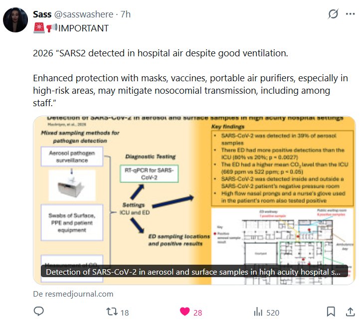 Sass @sasswashere · 🚨📢IMPORTANTE 2026 “SARS2 detectado en el aire del hospital a pesar de una buena ventilación. Una mayor protección con mascarillas, vacunas y purificadores de aire portátiles, especialmente en zonas de alto riesgo, puede mitigar la transmisión nosocomial, incluso entre el personal”.