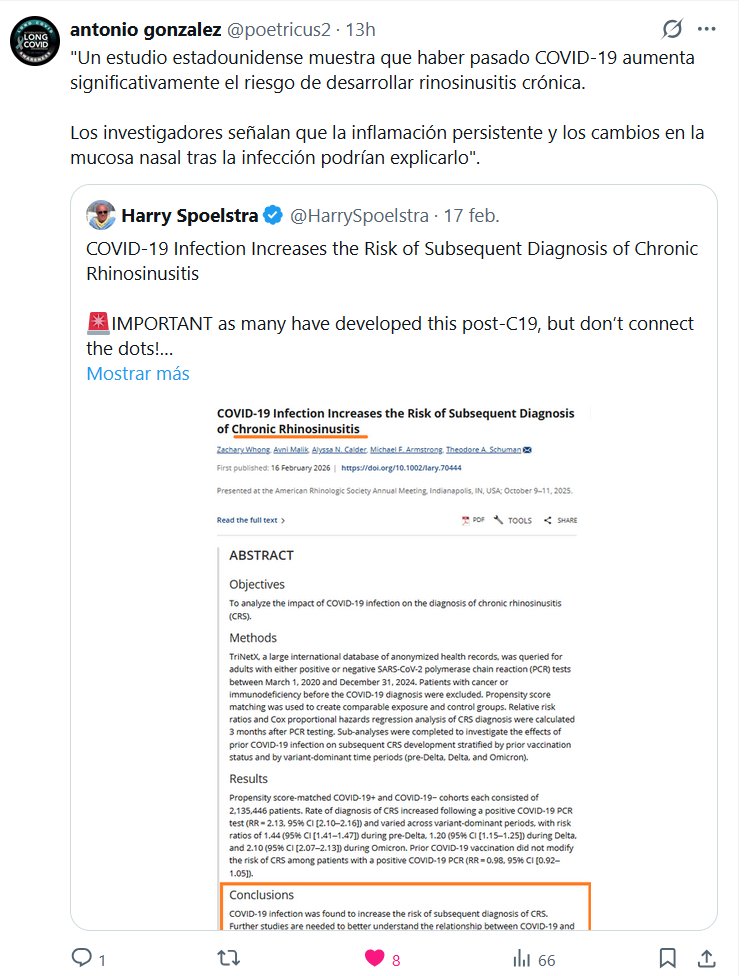 Prof. Antonio González @poetricus2 · «Un estudio estadounidense muestra que haber pasado COVID-19 aumenta significativamente el riesgo de desarrollar rinosinusitis crónica. Los investigadores señalan que la inflamación persistente y los cambios en la mucosa nasal tras la infección podrían explicarlo».