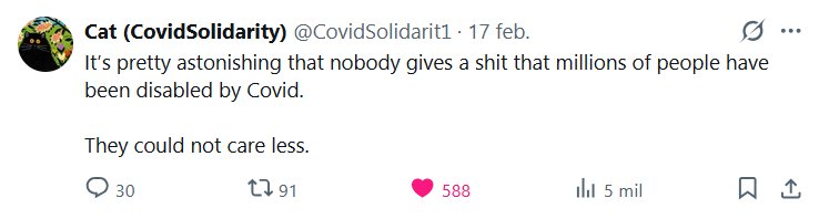 ESCUCHO VOCES: CAT (CovidSolidarity) @CovidSolidarit1 · Es asombroso que a nadie le importe que millones de personas hayan quedado discapacitadas por la COVID. No les importa nada.