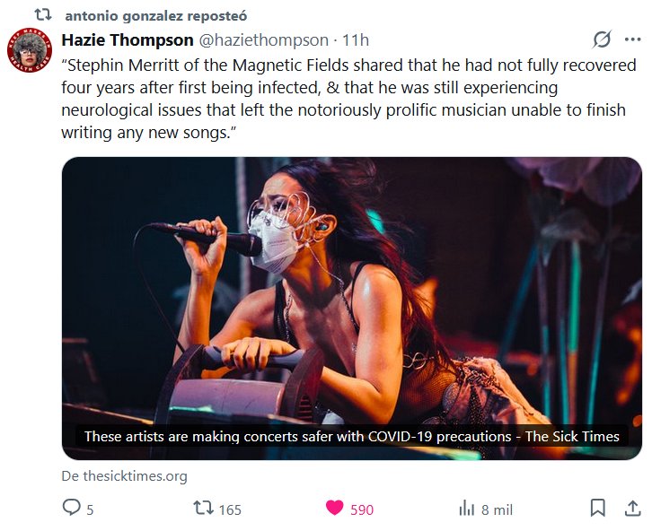 El profesor Antonio González repitió Hazie Thompson @haziethompson · “Stephin Merritt, de Magnetic Fields, compartió que no se había recuperado completamente cuatro años después de haberse infectado y que aún sufría problemas neurológicos que le impedían terminar de escribir nuevas canciones”.