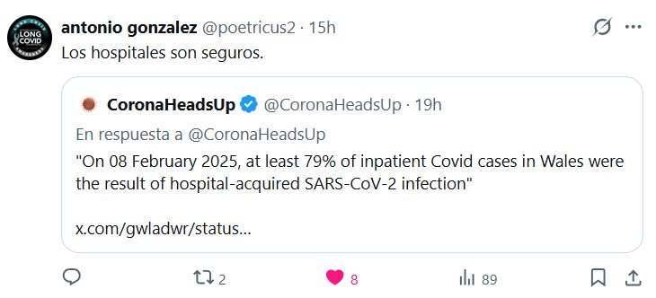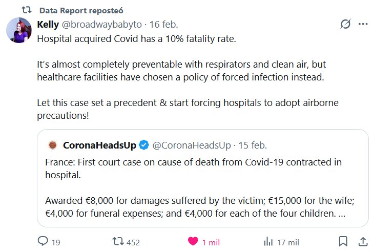 Data Report reposteó a Kelly @broadwaybabyto · 16 feb. 2026 La COVID-19 hospitalaria tiene una tasa de mortalidad del 10%. Es casi completamente prevenible con respiradores y aire limpio, pero los centros sanitarios han optado por una política de contagio forzado. ¡Que este caso siente precedente y se empiece a obligar a los hospitales a adoptar precauciones contra la transmisión aérea!