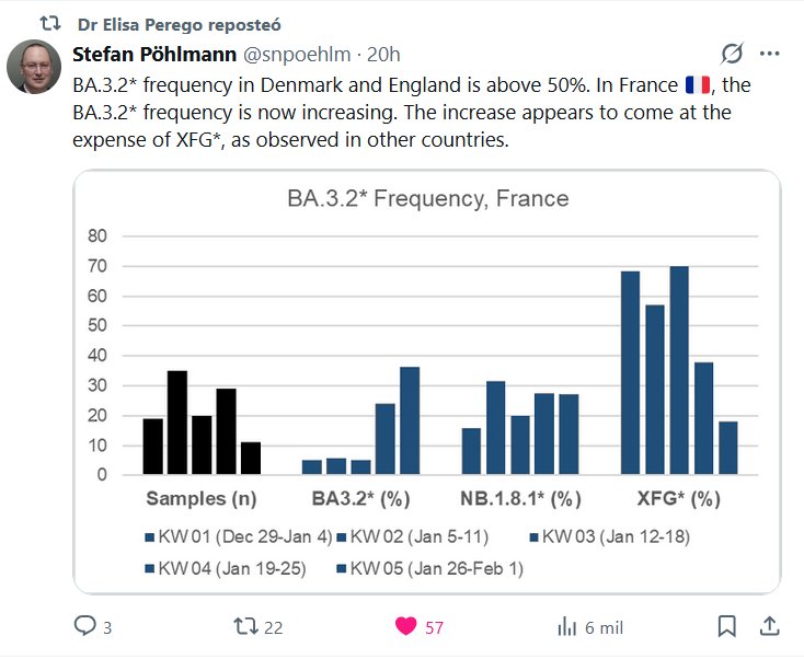 COVID 2026 La Dra. Elisa Perego reportó a Stefan Pöhlmann @snpoehlm · La frecuencia de BA.3.2* en Dinamarca e Inglaterra supera el 50 %. En Francia 🇫🇷, la frecuencia de BA.3.2* está aumentando. Este aumento parece producirse a expensas de XFG*, como se observa en otros países.