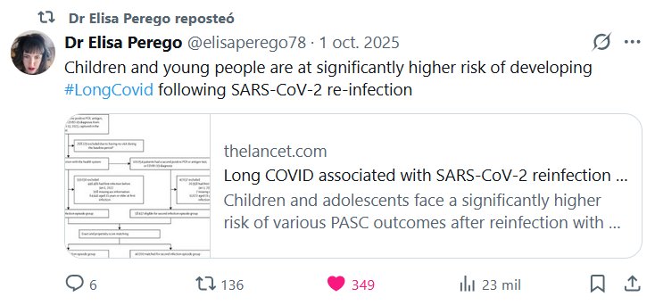 REITERAMOS Dra. Elisa Perego @elisaperego78 · 1 oct. 2025 Los niños y jóvenes tienen un riesgo significativamente mayor de desarrollar #CovidPersistente tras una reinfección por SARS-CoV-2.