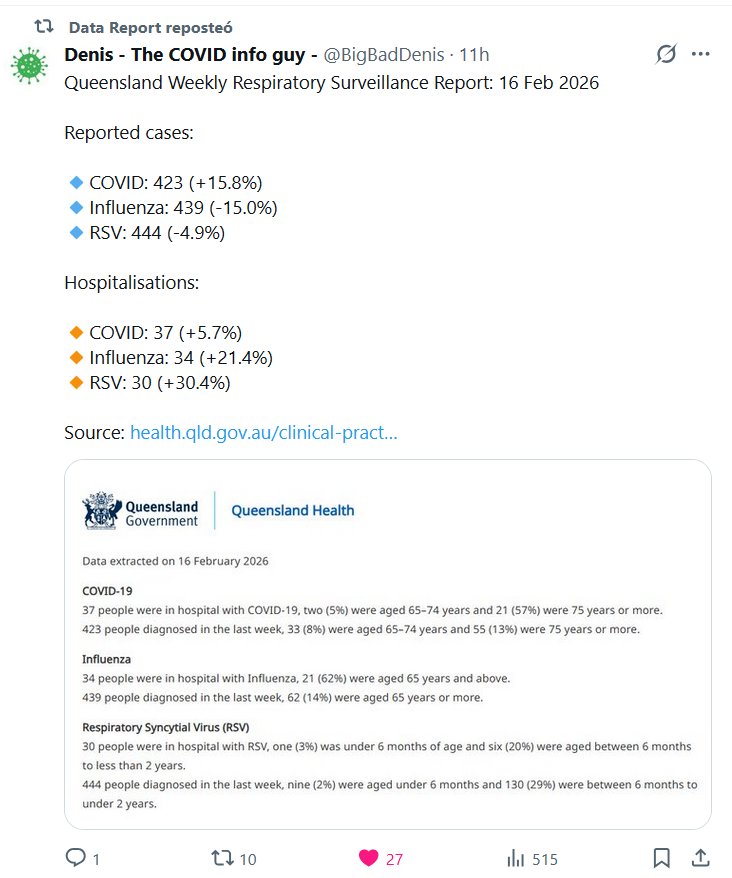 Informe Semanal de Vigilancia Respiratoria de Queensland: 16 de febrero de 2026 Casos notificados: 🔹COVID: 423 (+15,8%)